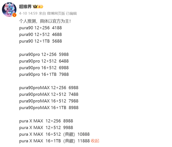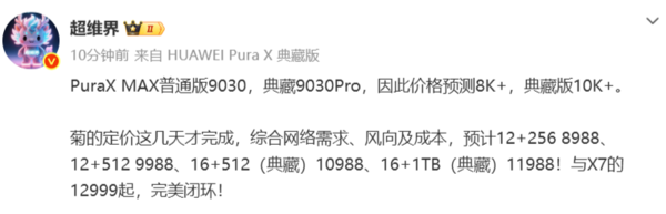该博主进一步透露,华为的定价这几天才完成,综合网络需求、风向及成本,博主预计华为Pura X Max 12GB+256GB版本售价8988元,12GB+512GB售价为9988元,16GB+512GB(典藏版)与16GB+1TB(典藏版)则分别定价为10988元和11988元。博主称,这一价格体系与华为Mate X7的12999元起售价形成了完美闭环。