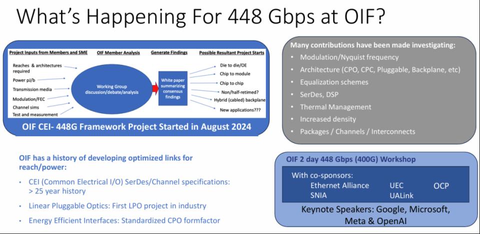 为避免技术分歧、凝聚行业共识,OIF 还联合以太网联盟、SNIA、OCP 等组织举办 448Gbps 专项研讨会,谷歌、微软、Meta、OpenAI 等 AI 巨头纷纷分享需求痛点,推动技术路线向实际应用落地倾斜。