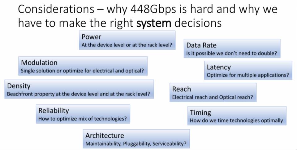 此外,可靠性的技术组合优化、数据速率是否必须强制翻倍、延迟如何适配多应用场景、电 / 光传输距离的平衡、技术落地的时序规划,以及架构的可维护性与可插拔性,每一项选择都牵一发而动全身,直接影响 448Gbps 系统的经济性与可行性。