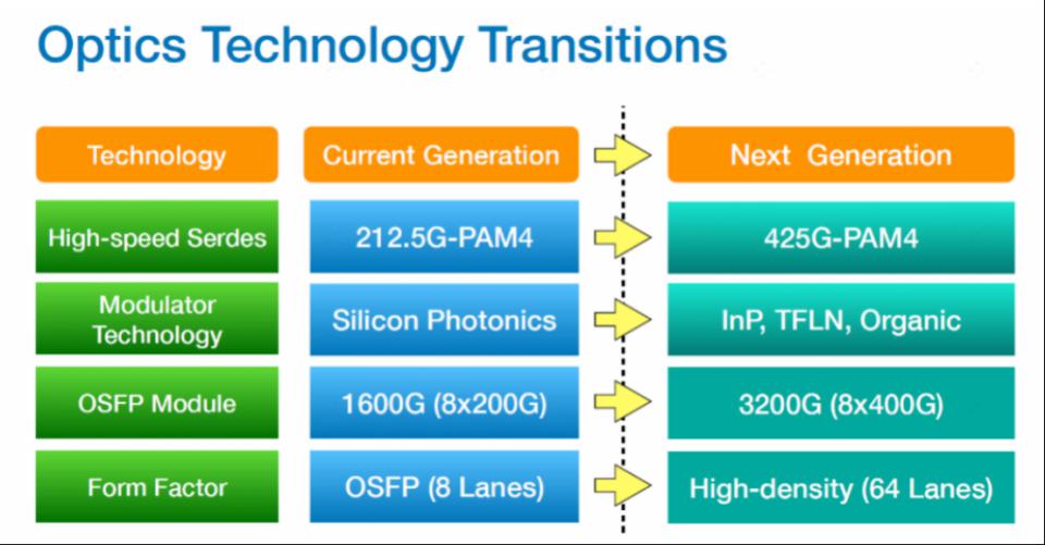 其中,Arista 讨论了下一代 400G 代际光学互连技术,阐述了光侧接口需要 PAM4 调制来达成较好的 OSNR,电侧接口需要优化 PAM4 SerDes 来达成系统最优,因为如果电侧接口为 PAM6 调制,则额外需要一个高功耗的 Gearbox。另外对于光侧的调制技术,传统 SiPh 受限于带宽也需要 InP、TFLN 等调制技术。